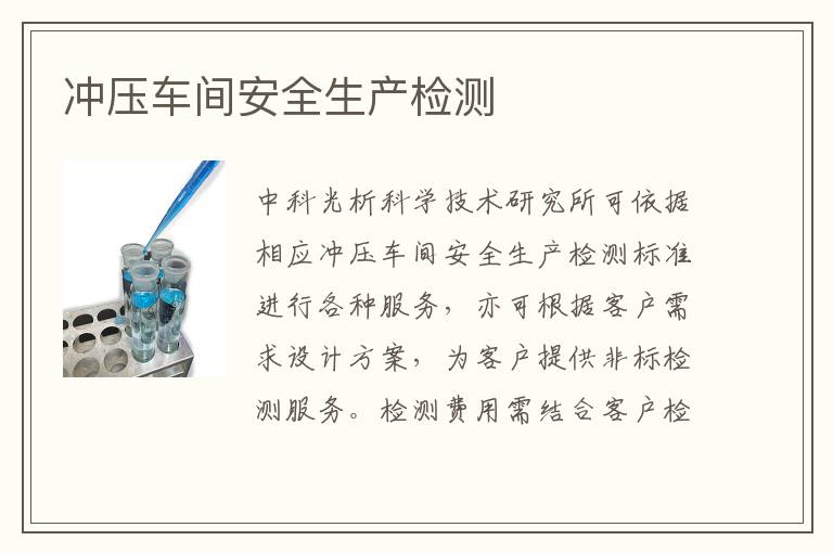 沖壓車間安全生產(chǎn)檢測(cè)范圍包括但不限于機(jī)械設(shè)備的穩(wěn)定性檢測(cè)、電氣設(shè)備的絕緣性能檢測(cè)、員工勞動(dòng)條件檢測(cè)等。