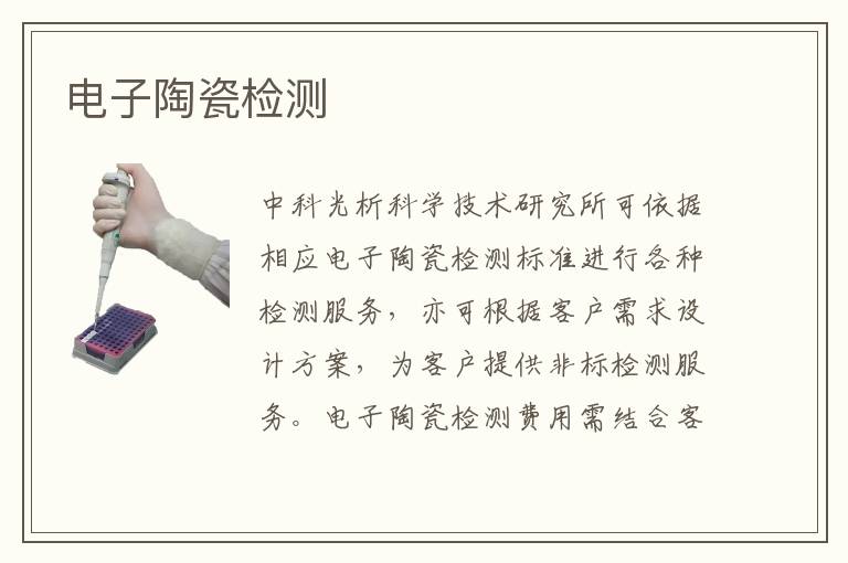 中科光析科學(xué)技術(shù)中析研究所可依據(jù)相應(yīng)電子陶瓷檢測標(biāo)準(zhǔn)進(jìn)行各種檢測服務(wù),亦可根據(jù)客戶需求設(shè)計方案,為客戶提供非標(biāo)檢測服務(wù)。電子陶瓷檢測費(fèi)用需結(jié)合客戶檢測需求以及實(shí)驗(yàn)復(fù)雜程度進(jìn)行報價。一般7-15個工作日可出具檢測報告。 ```html電子陶瓷是用于制造電子器件的陶瓷材料,具有優(yōu)良的電、熱、機(jī)械和化學(xué)特性。電子陶瓷檢測的主要目的是確保這些材料的性能和可靠性,以滿足電子行業(yè)日益增長的需求。正規(guī)的檢測技術(shù)能夠準(zhǔn)確評估材料特性,確保電子器件的質(zhì)量與性能。