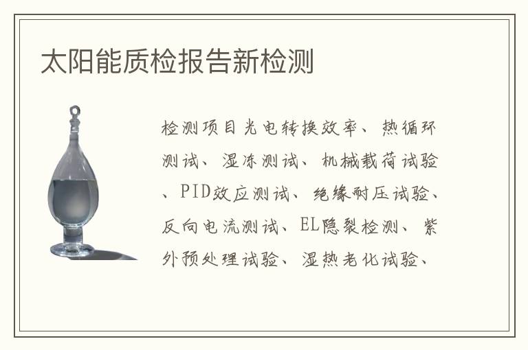 關(guān)鍵詞:太陽能質(zhì)檢報(bào)告新測試方法,太陽能質(zhì)檢報(bào)告新測試機(jī)構(gòu),太陽能質(zhì)檢報(bào)告新測試周期