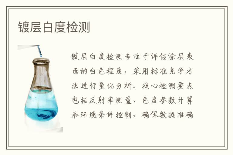 鍍層白度檢測通過光學(xué)測量方法評估鍍層表面的白度特性,包括反射率、色差和光澤度等參數(shù),確保材料外觀質(zhì)量符合工業(yè)標(biāo)準(zhǔn)和應(yīng)用要求,涉及精密儀器和標(biāo)準(zhǔn)化測試程序。