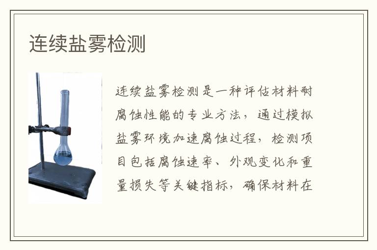 連續(xù)鹽霧檢測是一種評估材料耐腐蝕性能的專業(yè)方法,通過模擬鹽霧環(huán)境加速腐蝕過程,檢測項目包括腐蝕速率、外觀變化和重量損失等關(guān)鍵指標(biāo),確保材料在惡劣條件下的耐久性和可靠性,適用于多種工業(yè)領(lǐng)域。