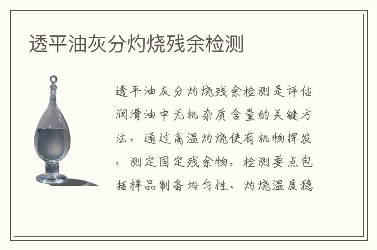 灰分含量測(cè)定:通過高溫灼燒透平油樣品使有機(jī)物完全分解,測(cè)定殘留無機(jī)物的質(zhì)量百分比,用于評(píng)估油品中添加劑、污染物或磨損顆粒的總量,確保結(jié)果準(zhǔn)確反映油品純凈度。