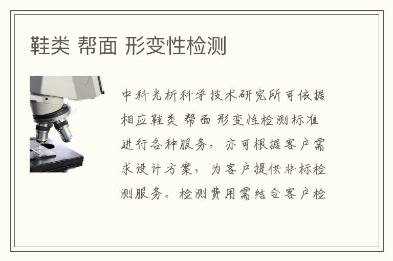 關(guān)鍵詞:鞋類幫面形變性測(cè)試范圍,鞋類幫面形變性測(cè)試周期,鞋類幫面形變性測(cè)試標(biāo)準(zhǔn)