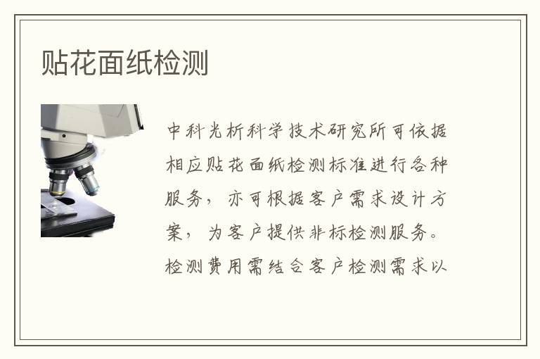貼花面紙檢測是保障產(chǎn)品質(zhì)量與安全性的核心環(huán)節(jié),其技術(shù)體系涵蓋多學(xué)科交叉與精密儀器應(yīng)用。隨著環(huán)保法規(guī)趨嚴(yán)和終端市場需求升級(jí),檢測標(biāo)準(zhǔn)與方法將持續(xù)迭代。企業(yè)需結(jié)合自身產(chǎn)品特性選擇合規(guī)的檢測方案,同時(shí)關(guān)注國際標(biāo)準(zhǔn)動(dòng)態(tài),以提升產(chǎn)品競爭力和市場認(rèn)可度。通過科學(xué)的檢測手段,貼花面紙行業(yè)將更好地滿足多樣化應(yīng)用場景的需求,推動(dòng)產(chǎn)業(yè)鏈高質(zhì)量發(fā)展。
