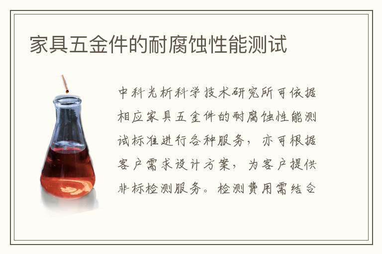 中科光析科學技術(shù)研究所可依據(jù)相應家具五金件的耐腐蝕性能測試標準進行各種服務,亦可根據(jù)客戶需求設(shè)計方案,為客戶提供非標檢測服務。檢測費用需結(jié)合客戶檢測需求以及實驗復雜程度進行報價。
