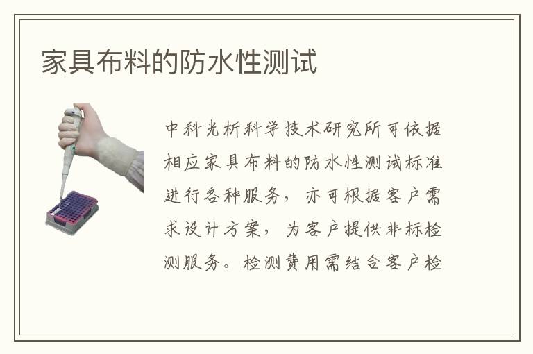 家具布料作為室內(nèi)裝飾的重要組成部分,其功能性直接影響產(chǎn)品的使用壽命與用戶體驗。其中,防水性能是衡量家具布料品質(zhì)的核心指標(biāo)之一。隨著消費者對家居環(huán)境要求的提升,防水布料在沙發(fā)、座椅、床墊等領(lǐng)域的應(yīng)用日益廣泛。防水性測試通過模擬液體滲透場景,評估材料抵御水分滲透的能力,為產(chǎn)品開發(fā)、質(zhì)量控制和行業(yè)標(biāo)準(zhǔn)制定提供科學(xué)依據(jù)。本文將從檢測項目、適用范圍、標(biāo)準(zhǔn)規(guī)范及測試方法等維度,系統(tǒng)解析家具布料防水性檢測的技術(shù)框架。